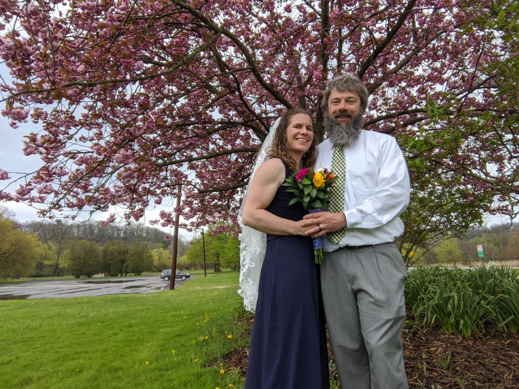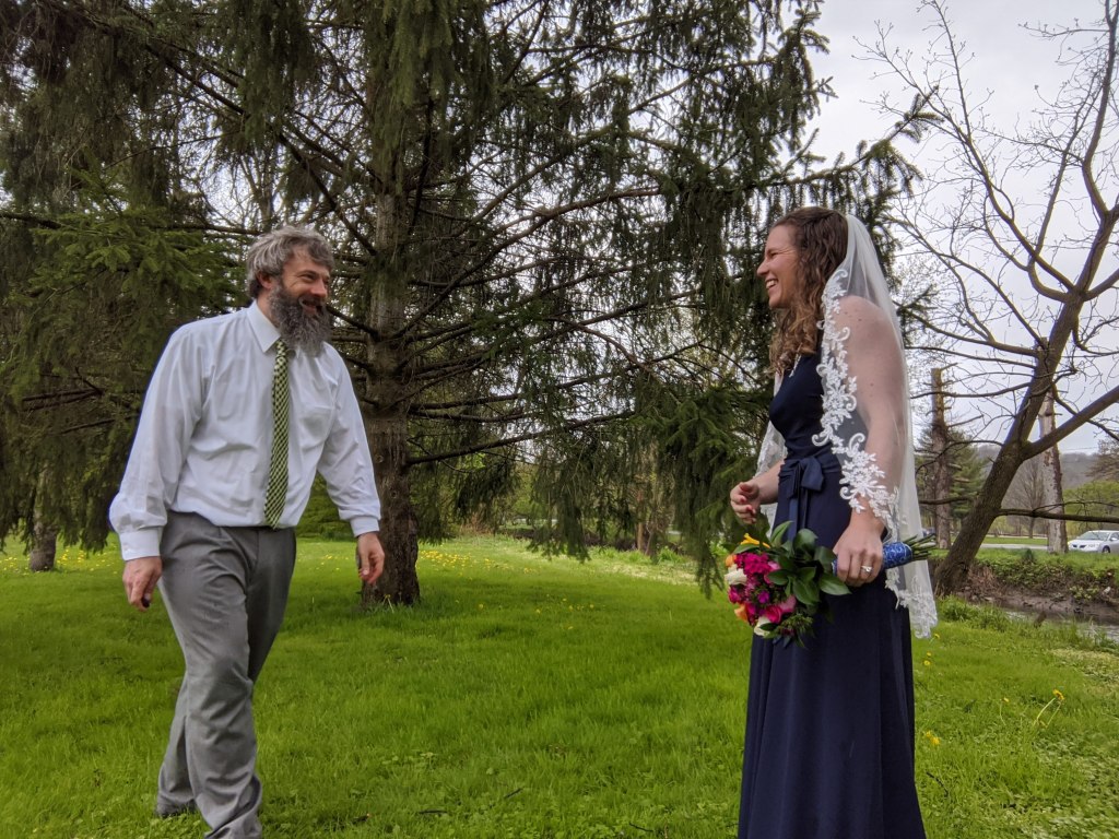 The celebration was cancelled and the house was sold, but we still needed to get Married. We ended up having the only type of wedding allowed under New York restrictions, a Zoom wedding. I had the bright idea that I still wanted to get married at a place pretty but the weather was not agreeable. It was raining outside all day but it looked like the storms would break for our little ceremony. We drove over to a local park where we found a shelter and tethered a laptop to my cell phone for the wedding, right as it started pouring rain. We followed the script even though I don’t think anyone could really hear, and within about 5 minutes the officiant pronounced us husband and wife. We had a little tripod and remote snap button that we used to try to take a couple wedding pictures.